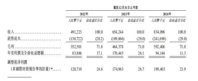 业绩表现来看,公司正处于营收与净利润均增长阶段。2022年至2024年(以下简称:报告期内,下同),公司的营收分别为4.91亿元(单位:人民币,下同)、6.54亿元、8.34亿元,复合年增长率为30.3%。同期,圣桐特医的毛利率分别为71.8%、71.0%和71.0%,毛利率之高,足见特医食品生意的利润之丰厚。