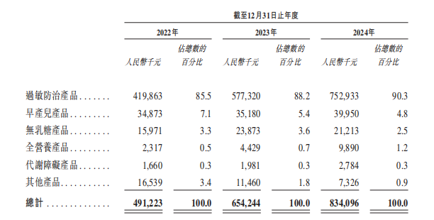 圣桐特医2024年来自过敏防治产品收入为7.53亿元,占比为90.3%;来自早产儿产品收入为3995万元,占比为4.8%;来自无乳糖产品收入为2121万元,占比为2.5%。可见过敏防治产品是公司的营收支柱。